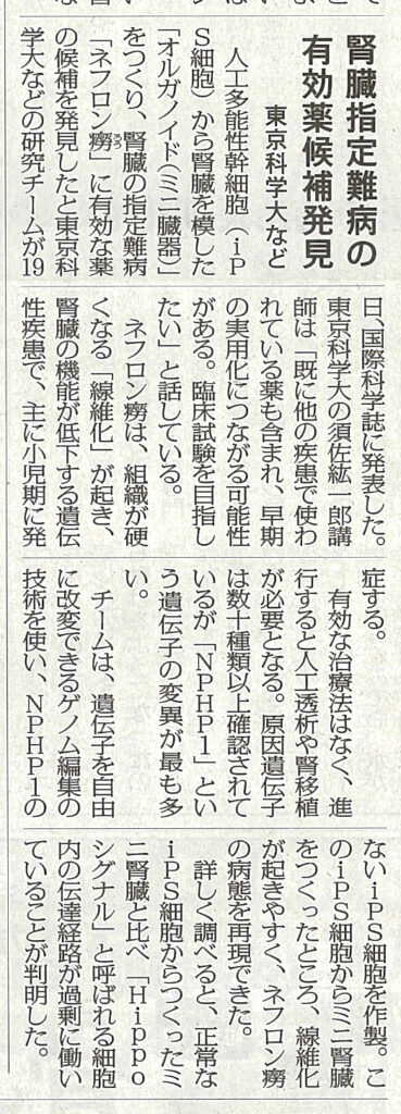 指定難病ネフロン癆のiPS創薬論文がプレスリリースされ、毎日新聞やYahooニュースに記事が掲載されました